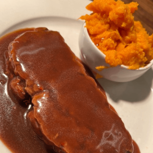 This is not your Mama's meatloaf, this is your Daddy's meatloaf. Blend of brisket and short rib gives it a bold flavor with a steak feel. Complete with a rich Demi-glace, mashed potatoes and sweet seasoned corn.